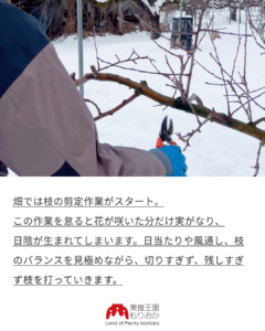 2月のりんご畑では、木の枝の剪定作業がスタート。